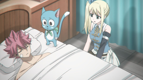 When Jacob Lessio comes and attacking Fairy Tail guild and makes everyone vanish, Lucy's Celestial spirit Horologium saves Natsu and Lucy right in time. Buuuuut while they were safe inside the clock, the were naked LOL. Lucy begins her fight after saving Mavis and Natsu woke up and saves Lucy from a Dagger attack. They fight together. When Jacob Lessio makes Lucy's clothes vanish, he forces Natsu to look at her but Natsu has seen Lucy naked many times so he didnt care. They use his trick against him and kicks him at the same time.